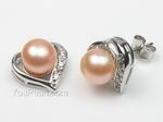 Heart pink pearl stud earrings wholesale online, 7-8mm, 925 silver