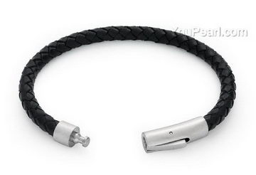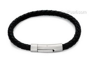 Stainless steel unisex black braided round leather cord bracelet, 6mm