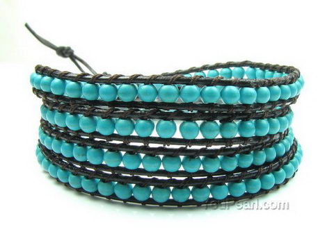 Turquoise gemstone bead long leather wrap bracelet for sale, 36 inches