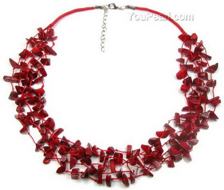 The gemstone necklace is composed of 5 chip strands, and finished with a copper lobster claw clasp.
