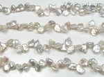 They are flat and highly irregular. Keishi pearls are formed when a mollusk tries to expel a bead nucleus, but continues to make a pearl. Its size is measured by its longer length range (e.g. 7-8mm).