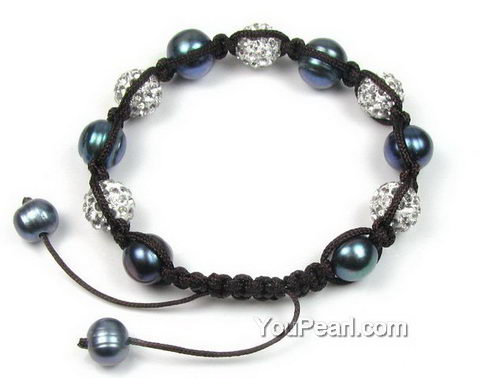 Peacock black freshwater pearl shamballa crystal ball bracelet, 10mm