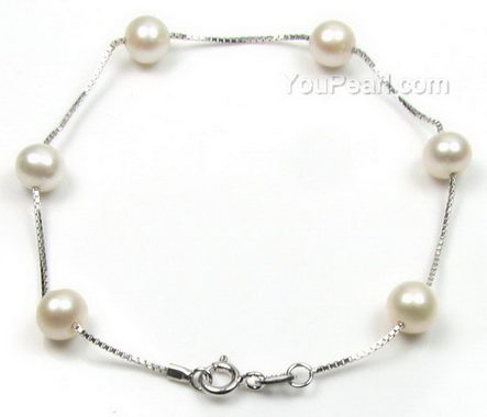 Sterling silver tin cup off-round white cultured pearl bracelet, 7-8mm