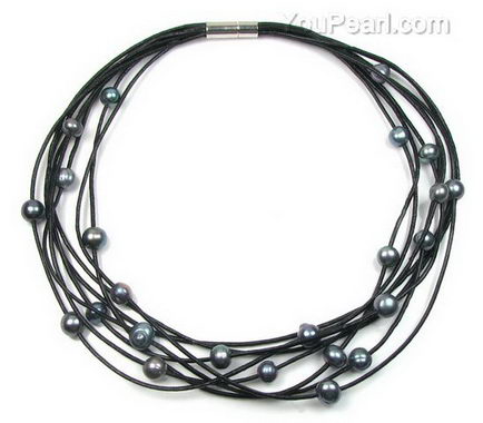 Peacock black freshwater pearl multi-strand leather necklace on sale