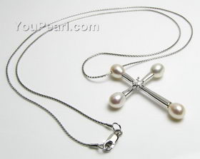 Sterling silver cross white rice freshwater pearl necklace wholesale, 6-7mm