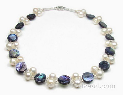 The beautiful necklace is composed of abalone coin beads and baroque pearls.