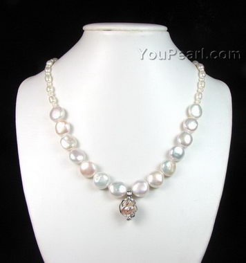 Natural color coin pearl with cage pendant necklace discounted sale