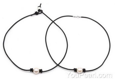 Single pearl choker necklace, leather floating pearl necklace onsale, 11mm