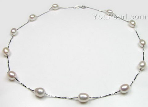 925 silver tin cup white rice fresh water pearl necklace, 6-7mm