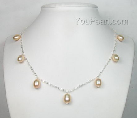Sterling silver pink/peach pearl tincup necklace for sale, 7-8mm
